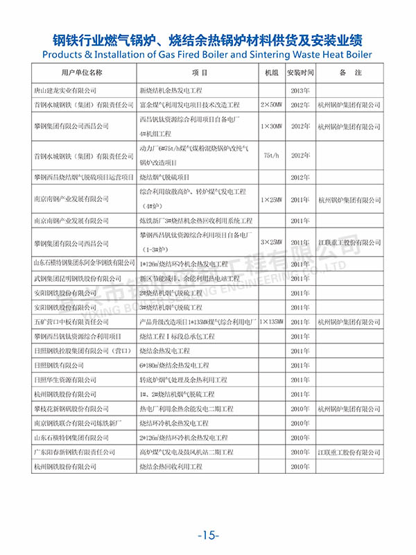 鋼鐵行業燃氣鍋爐、燒結余熱鍋爐材料供貨及安裝業績(四)